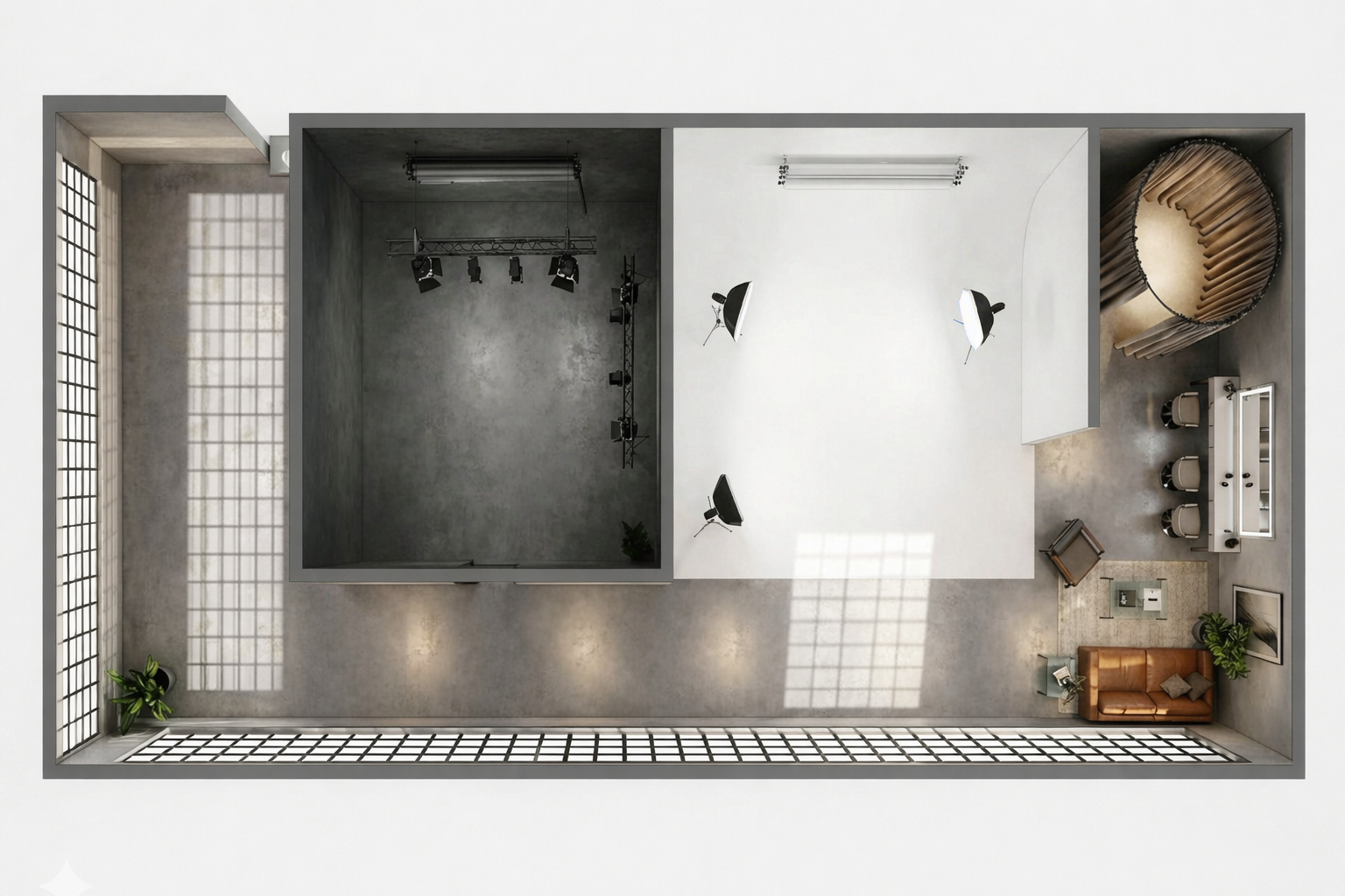 Grey Space: Designed for depth, mood, and texture. This area provides a more atmospheric and grounded environment for dramatic or editorial work.